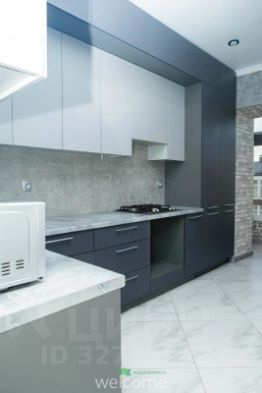 встроенный кухонный гарнитур с матовыми фасадами. Установлена варочная панель с вытяжкой и раковина со смесителем. Есть вывод и отдельный шкаф под посудомоечную машинку.