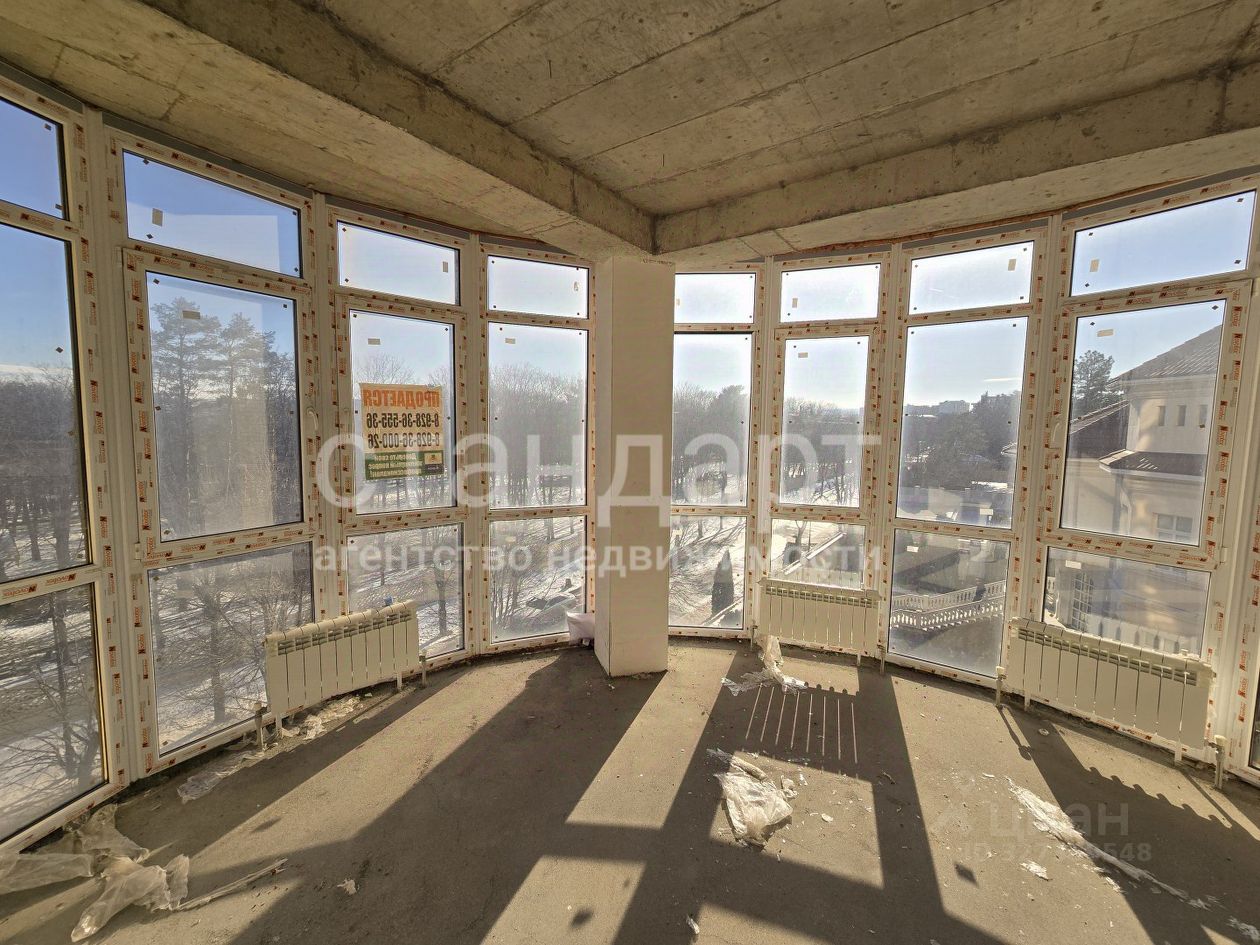 Состояние после строителей, на стенах гипсовая штукатурка, ввод электрики в квартиру, сделана стяжка, разводка системы отопления, теплый пол, установлен 2х конт.котел, одна из комнат с панорамным остеклением.