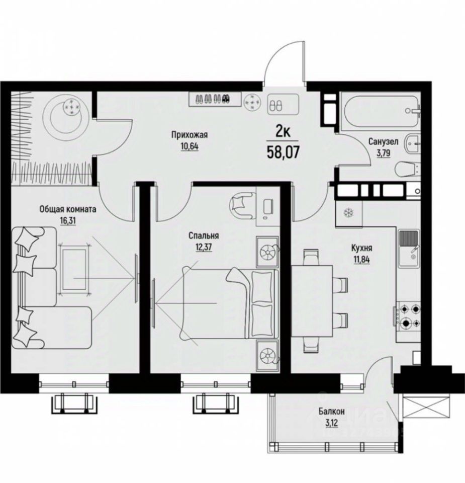 Просторная квартира с двумя балконами и лоджией, с просторной кухней-гостиной.