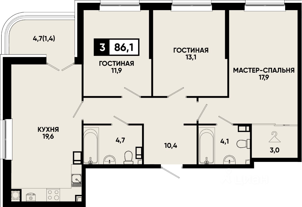 Общая площадь86,1 м²