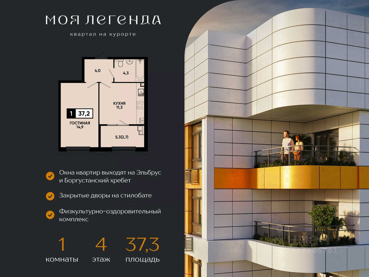1комнатная квартира в ЖК "Моя Легенда" — курортная жизнь с готовым ремонтом от федерального застройщика ЮгСтройИнвест! Представляем уютную 1комнатную квартиру в уникальном курортном квартале "Моя Легенда" с продуманной планировкой, которая идеально подходит для жизни, отдыха и инвестиций. О квартире — комфорт и функциональность: Светлая комната с объединенной кухней-гостиной и зоной для сна; Панорамные окна высотой 2,2 м открывают вид на Эльбрус, Боргустанский хребет и Новое озеро; Удобное расположение мокрых зон для техники и экономии бюджета на ремонте; Идеальная планировка для проживания, сдачи в аренду или инвестиций; Квартира с готовым ремонтом под ключ, мебелью и техникой. ЖК "Моя Легенда" — курортный комплекс: — 21 дом переменной этажности (914 этажей) на территории более 15 га; — Закрытые дворы на стилобате с концепцией "без машин", детские и спортивные зоны, лаунж-зоны; — Подземный и наземный паркинг; — Холлы с дизайнерской отделкой, стеклянные двери, керамогранит премиум-класса, подсветка; — Коммерческие помещения на стилобате: магазины, кафе, салоны красоты; — Собственный детский сад и физкультурно-оздоровительный комплекс. О застройщике — ЮгСтройИнвест: Мы создаём не просто дома, а полноценные городские кластеры с инфраструктурой под ключ: школы, детские сады, дороги, парки и коммерческие объекты. Надежность подтверждена: Более 20 лет работы на рынке недвижимости Юга России; Полное соблюдение ФЗ-214 — прозрачность каждой сделки; Сотни тысяч кв. метров сдано строго в срок; Высокие стандарты качества — от фундамента до благоустройства; Девелопер, создающий среду для жизни и инвестиций. Локация и преимущества: — Новое озеро, гора Кольцо и центр города в шаговой доступности; — Парковые зоны, прогулочные маршруты, спортивные и развлекательные локации; — Вид на Эльбрус, Боргустанский хребет и Новое озеро; — Удобная транспортная доступность и выезды. Акции и выгодные предложения: Ипотека от 6% — семейная, для ИТ- специалистов и госслужащих; Рассрочка от застройщика с ПВ от 30%; Скидка молодоженам на квартиры; Ипотека без первого взноса; Возможность использовать материнский капитал; Квартира с парковкой по цене квартиры — выгода до 1,4 млн ₽; Траншевая ипотека; Условия покупки: — Дистанционная сделка — удобно для тех, кто не может посетить офис лично; — Полное оформление по 214-ФЗ; — Сопровождение сделки от выбора квартиры до передачи ключей; — Инвестиционная привлекательность. Заполните заявку сейчас — наш менеджер подберет оптимальную планировку, рассчитает ипотеку и забронирует вашу студию. ЖК "Моя Легенда" — курортная жизнь с видом на Эльбрус, готовый ремонт и комфортные условия покупки! * Рендеры носят иллюстративный характер и демонстрируют возможный вариант оформления квартиры, не являясь ремонтом от застройщика.