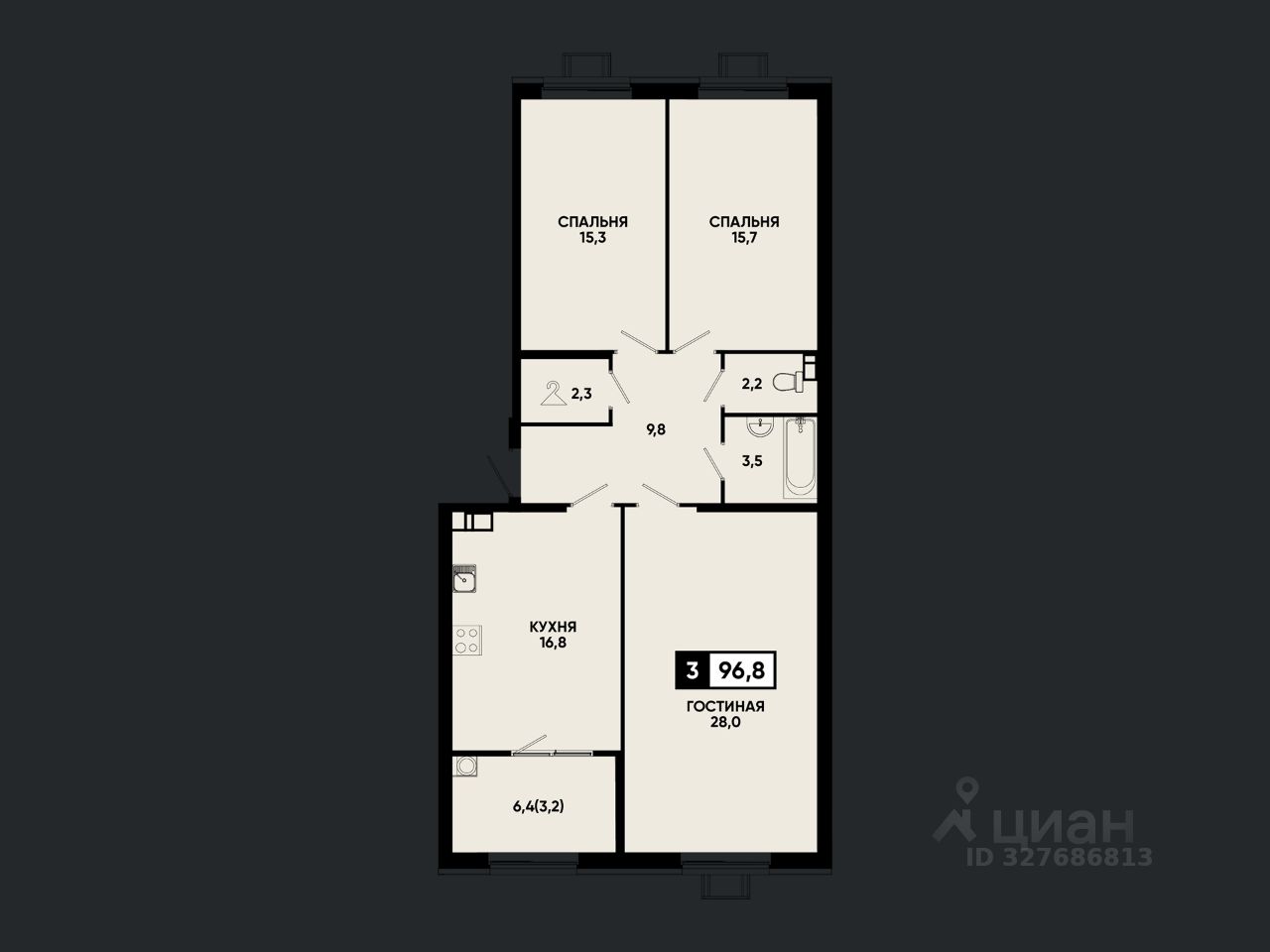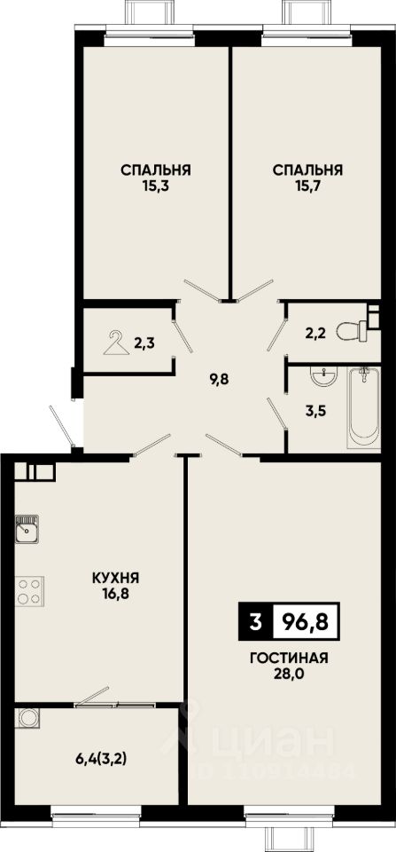 Три раздельные комнаты и просторная кухня-гостиная — комфорт для всей семьи;