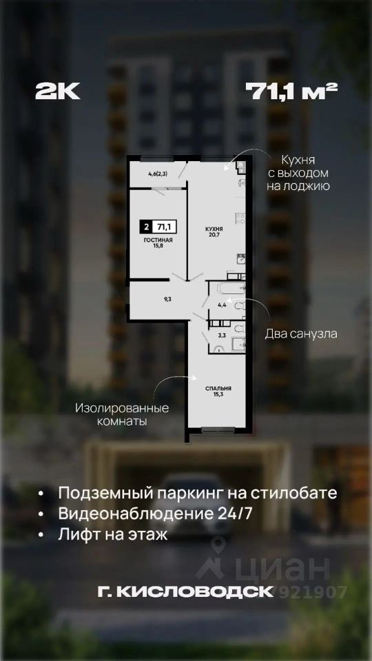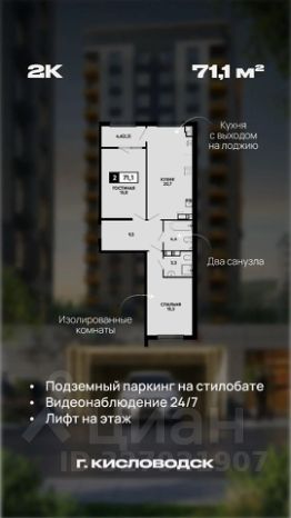 Квартира с видом на Эльбрус! 71 кв.м, терраса на лоджии, 2 комнаты. Кисловодск.