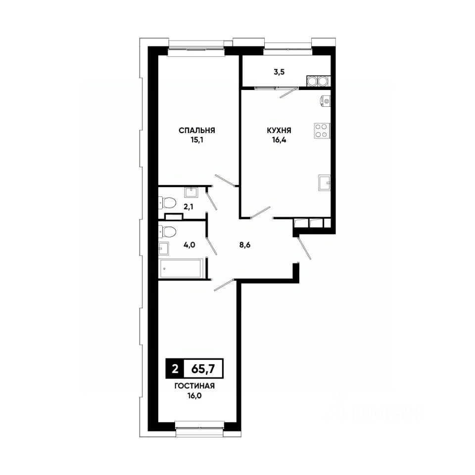 Две изолированные комнаты и просторная кухня-гостиная — максимум комфорта для жизни и работы;
