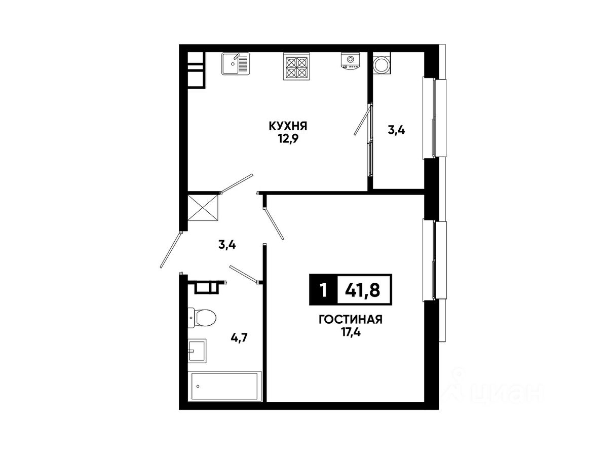 — Грамотная планировка, легко зонируется на спальню и гостиную;