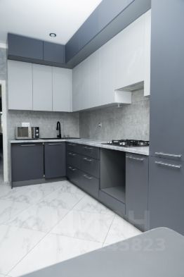 встроенный кухонный гарнитур с матовыми фасадами. Установлена варочная панель с вытяжкой и раковина со смесителем. Есть вывод и отдельный шкаф под посудомоечную машинку.