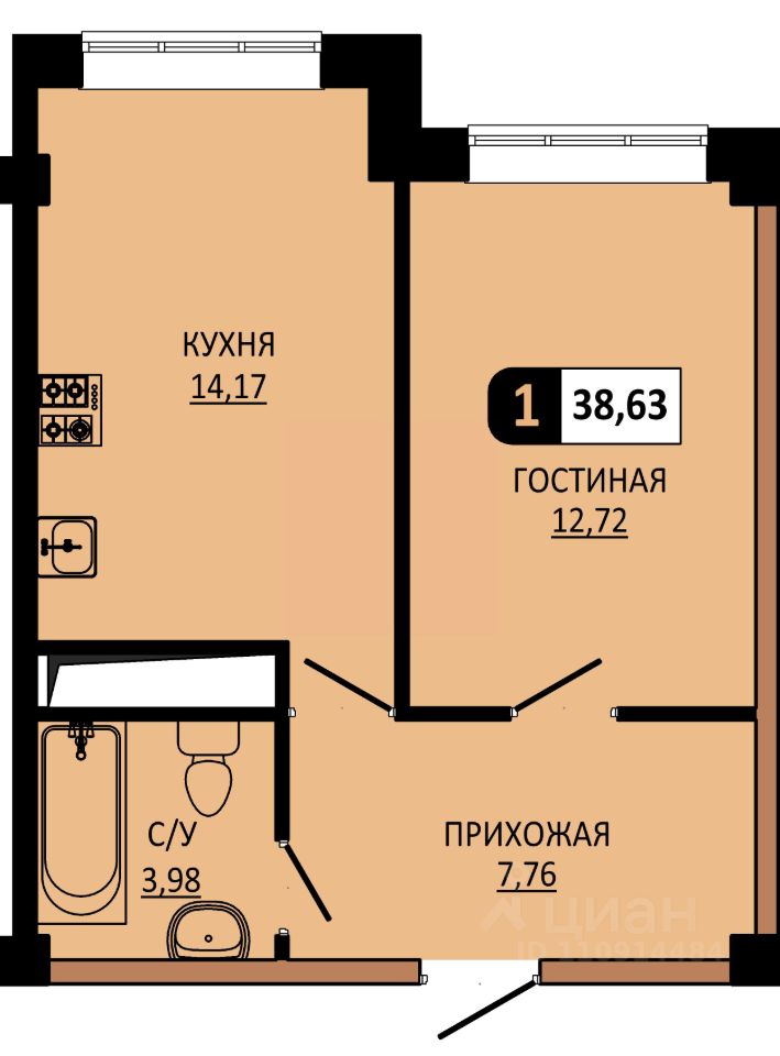 Общая площадь38,63 м²
