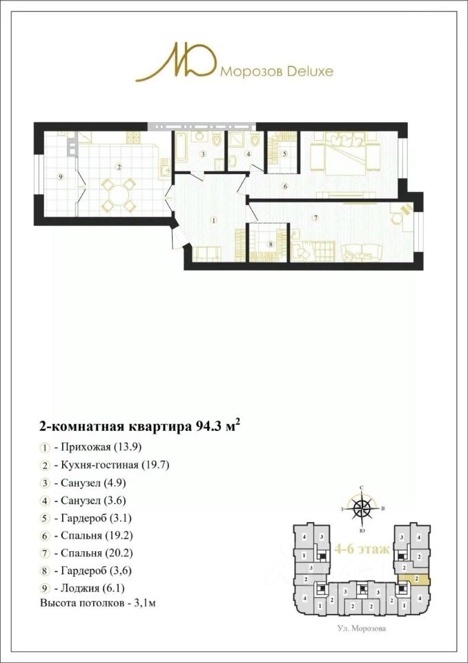 Продаётся 2-комнатная квартира в строящемся доме (Дом 11), срок сдачи: II-кв. 2026, общей площадью 94.3 кв.м., на 6 этаже. Новый жилой комплекс "Морозов Deluxe" от Специализированного застройщика "Премиум Сити СК" расположен по адресу: г. Ставрополь, по ул. Михаила Морозова.