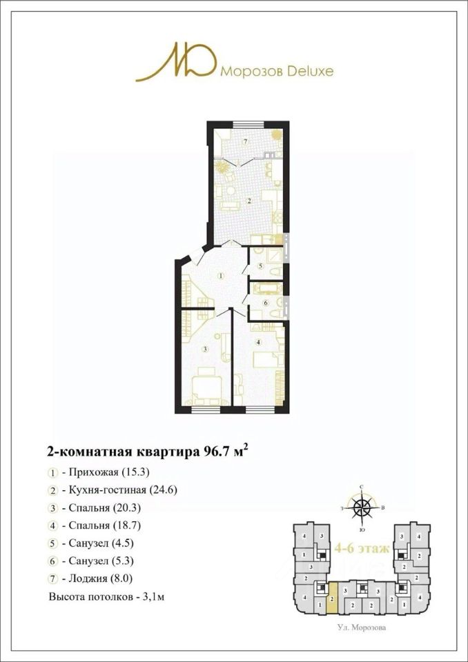 Продаётся 2-комнатная квартира в строящемся доме (Дом 11), срок сдачи: II-кв. 2026, общей площадью 96.7 кв.м., на 6 этаже. Новый жилой комплекс "Морозов Deluxe" от Специализированного застройщика "Премиум Сити СК" расположен по адресу: г. Ставрополь, по ул. Михаила Морозова.