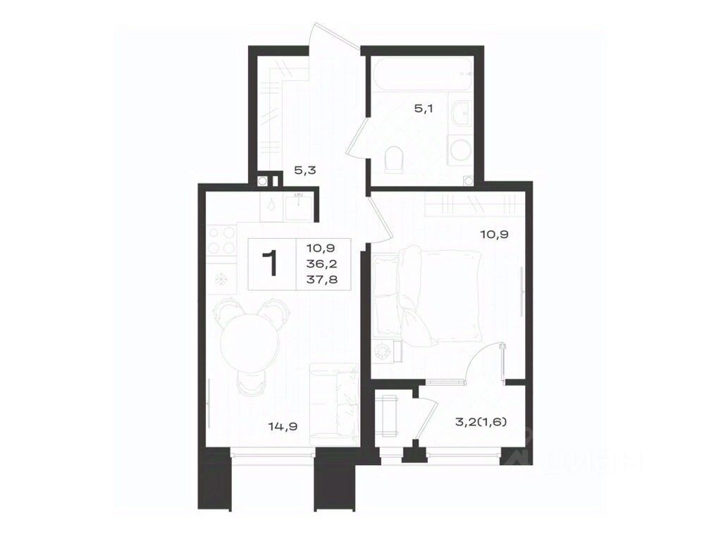 Общая площадь37,8 м²