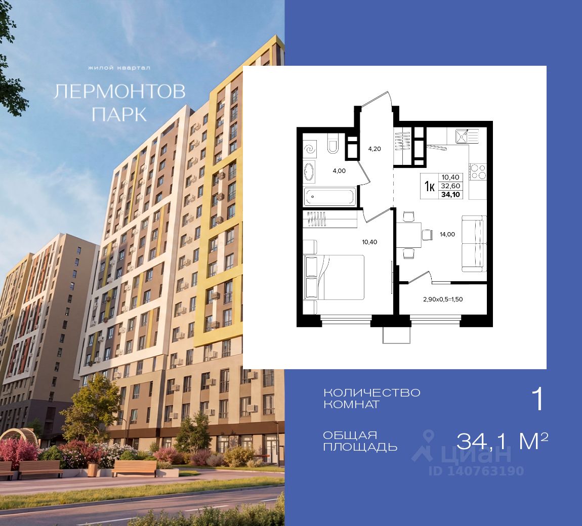 В продаже 1-комнатная квартира квартира площадью 34.10 кв. м, расположенная на 8 этаже, в новом жилом комплексе "Лермонтов Парк". Квартира сдается с черновой отделкой. Проект от застройщика PARADE Development находится в Ставропольском крае, на территории поселка Джуца, в окружении развитой курортной инфраструктуры.