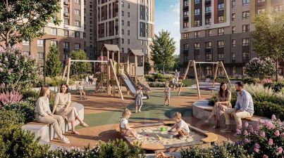 На территории приватного двора "Лермонтов Парк" будут высажены деревья и кустарники, обустроены спортивные, детские и прогулочные площадки. Отдельно расположится парковка, зона тихого отдыха, парковое пространство. Около 50% детских площадок займет озеленение.