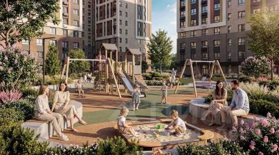 На территории приватного двора "Лермонтов Парк" будут высажены деревья и кустарники, обустроены спортивные, детские и прогулочные площадки. Отдельно расположится парковка, зона тихого отдыха, парковое пространство. Около 50% детских площадок займет озеленение.