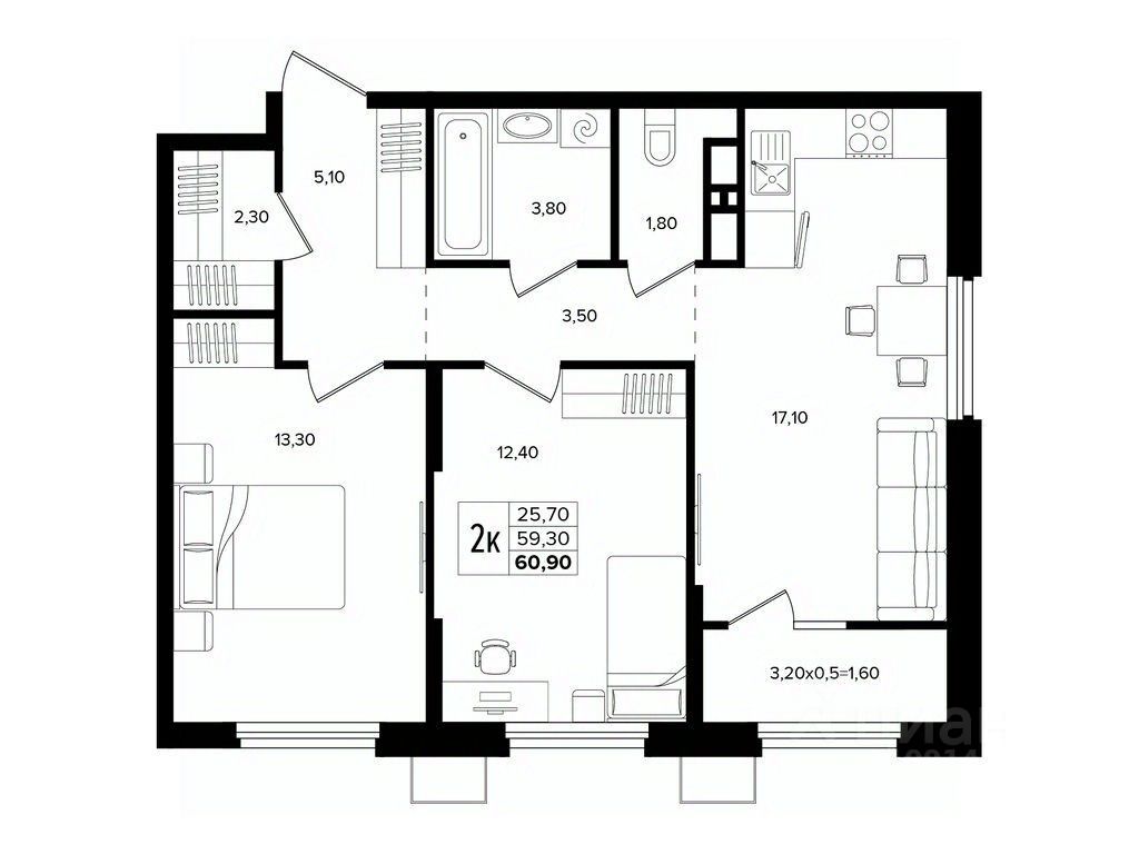 Общая площадь60,9 м²