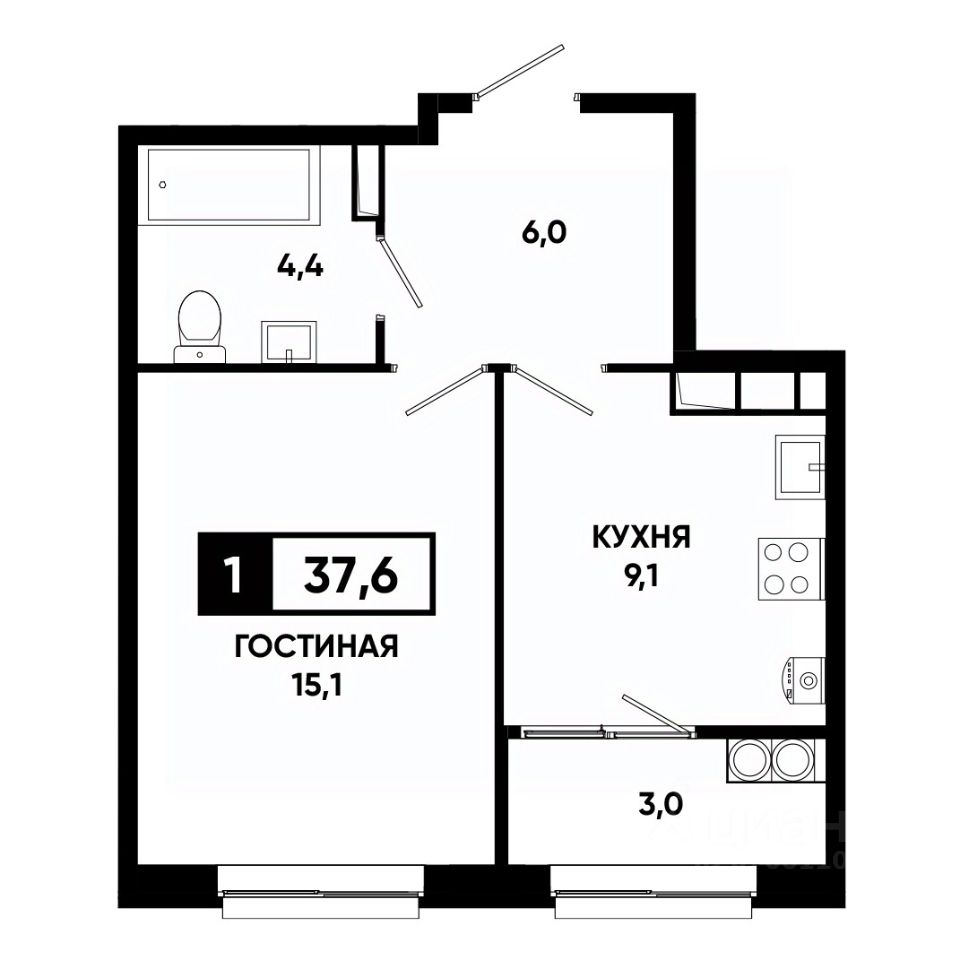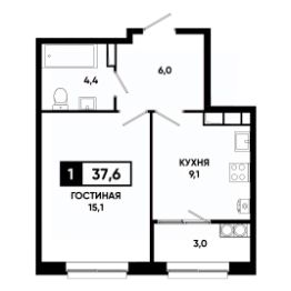 Просторная 1-комнатная квартира с кухней-гостиной и отдельной зоной для сна;