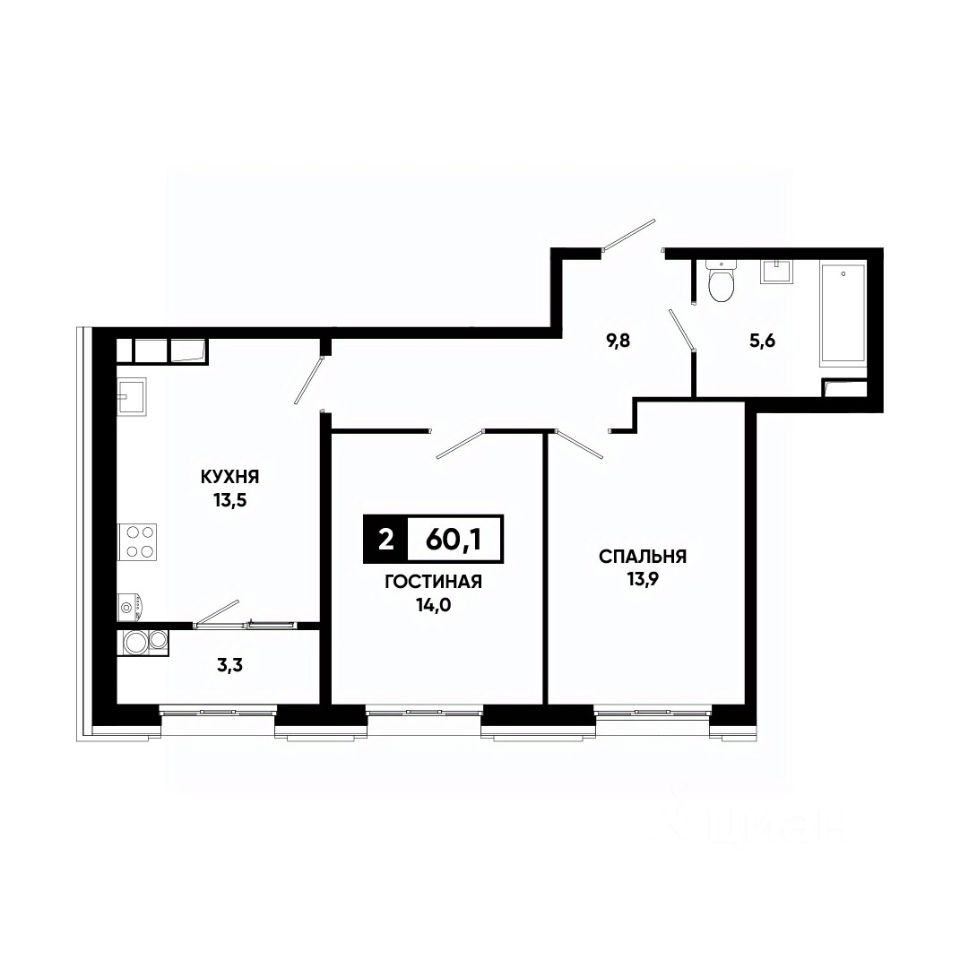 Две изолированные комнаты и просторная кухня-гостиная — максимум комфорта для жизни и работы;