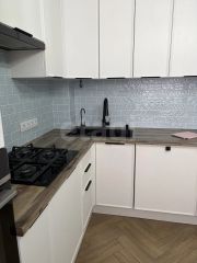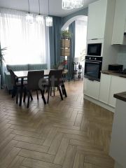 Кухня : большой холодильник, духовка, варочная панель, посудомоечная машина (60 см), вытяжка, микроволновая печь. Обеденная зона со столом и диваном.
