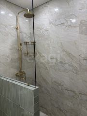 Ванная: тумба с раковиной, шкаф-пенал, унитаз, душевой трап со стеклянной перегородкой.
