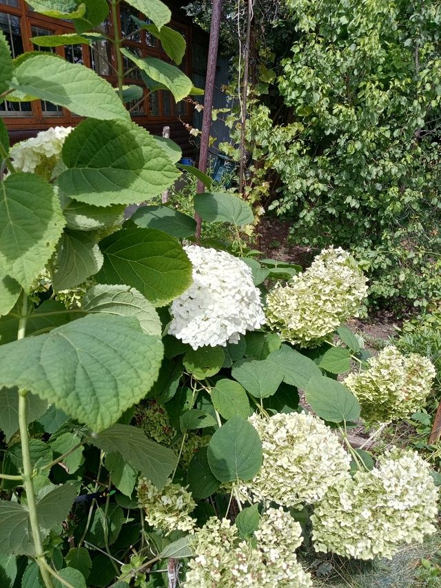 Много плодовых деревьев(яблоня, груша, абрикос, вишня)кустарники-смородина, ежевика, виноград, много цветов- пионы. гортензия. хосты, розы.
