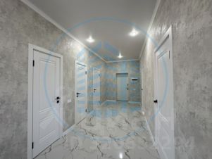 На полу в прихожей, кухне, гостиной, а так же в сан/узле керамогранит;