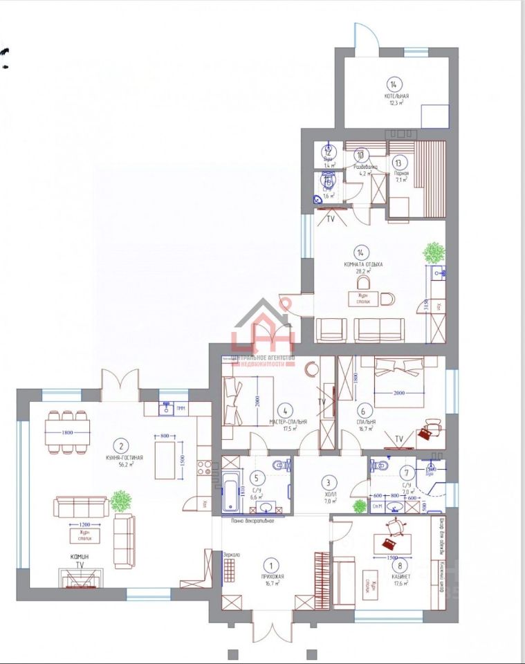 предусмотрели размещение бассейна, заложив его основание. Также предлагаем Вам проект зонирования в зоне гостиной