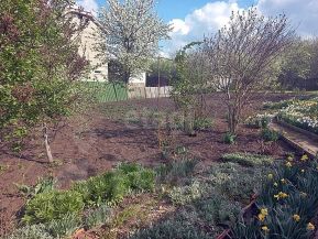 Высажены фруктовые деревья, кустарники.