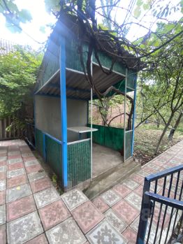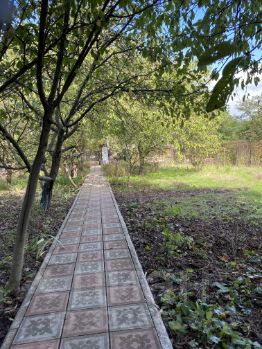 * На участке плодоносящий сад и ароматный виноградник, а также хозпостройка из кирпича в дальнем конце участка.