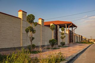 По периметру коттеджного поселка высажены ели, туи и сделан ландшафтный дизайн въездной группы.