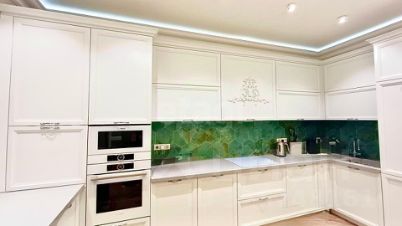 Ремонт выполнен по дизайн-проекту с применением качественных материалов: массив дерева в изготовлении кухонного гарнитура, стола, стульев и винтовой лестницы, каменная столешница, испанская плитка на фартуке, керамогранит в санузлах. Кухня оснащена техникой Bosch, Neff и Haier, установлена система фильтрации воды.