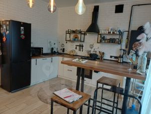 Кухня оборудована столом-баром, эффектными светильниками и подсветками.Интерьер уютный и современный, с акцентом на функциональность и комфорт. Пространство организовано так, чтобы создать ощущение открытости и легкости, при этом сохраняя приватность отдельных зон.