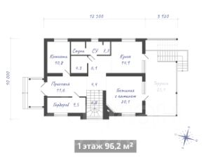 1 этаж: Гостиная с камином и кухня-столовая с выходом на террасу, санузел, сауна, гардеробная, комната.