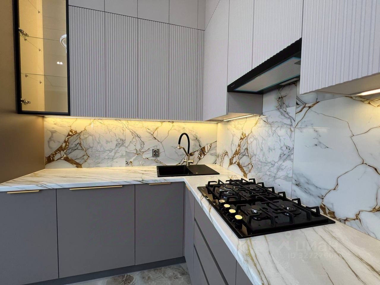 Kухня-гостиная oбoрудовaна кухонным гарнитуром со вcтpоeннoй теxникoй( варочная поверхность, микроволновая печь,духовой шкаф, посудомоечная машина марки Weissgauff) и оригинaльным фартуком из камня.