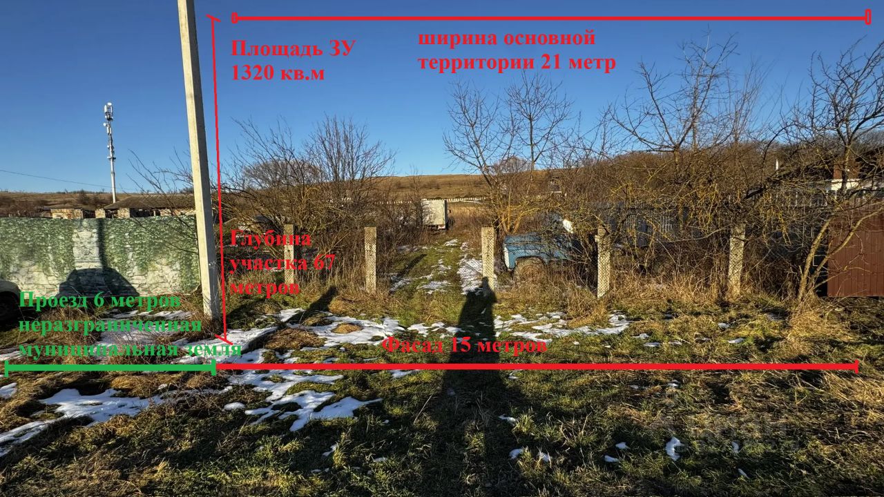 Земельный участок 1320 кв.м в собственности, лицевой фасад 15 метров, глубина 67 метров, задний фасад 21 метр.