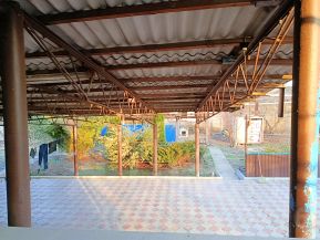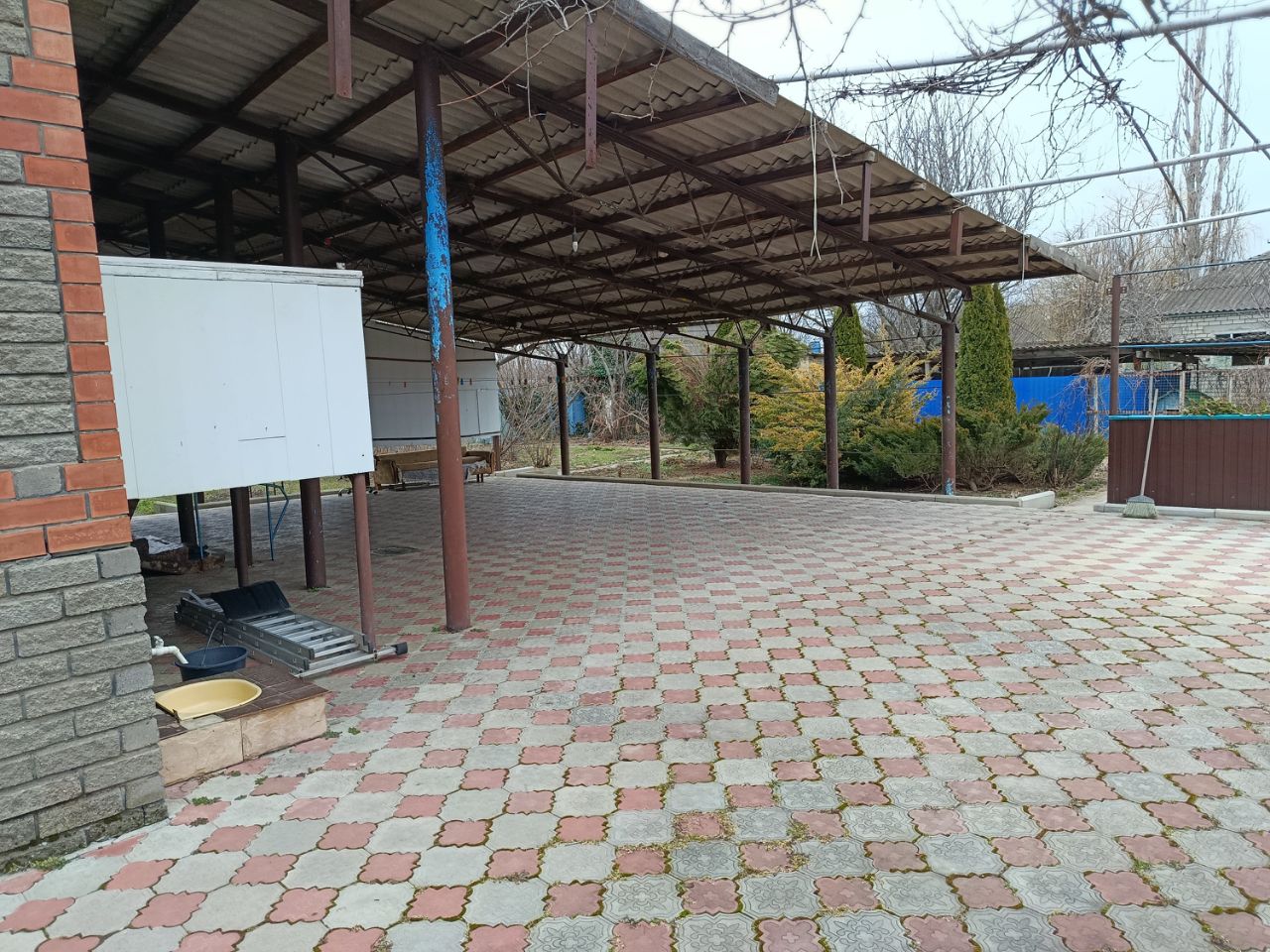 Во дворе дома растут плодовые деревья: яблоня, груша, абрикос, айва, вишня, черешня, кизил и виноград. Двор выложен тротуарной плиткой, имеется прочный навес, гараж (холодный), хозяйственные постройки и летний душ.