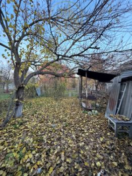 Во дворе дома большой навес, есть место для зоны барбекю, за домом не большой огород, посажены плодовые деревья. Площадь дома 140 м2, площадь участка 5,5 соток, земля в собственности