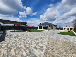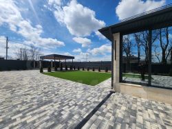 Во дворе установлена система теплого Пола под брусчаткой и лестничного марша. Автополив. На территории посажано 47 туй смарагд. Дровница . Рулонный газон ( спортивный -100% мятлик Канада) Современный навес на два автомобиля с трехфазной розеткой для зарядки смарт автомобиля. Хоз блок .
