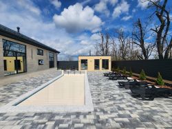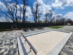 Бассейн с обрамлением из копингового камня для круглогодичного использования с системой фильтрации, автодозации химией, авто доливом . С индивидуальным котлом обогрева ( smаrt) . Защитная автоматическая ролета.