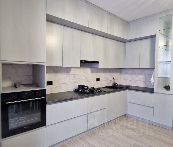 Квартира общей площадью **61 м²** — одна из самых больших среди однокомнатных в районе. Просторная гостиная объединена с кухней в стильном студийном формате, что создаёт ощущение простора и света. **Ремонт — современный**, выполнен из качественных материалов: натяжные потолки, тёплый пол, дизайнерская плитка, стильные межкомнатные двери.