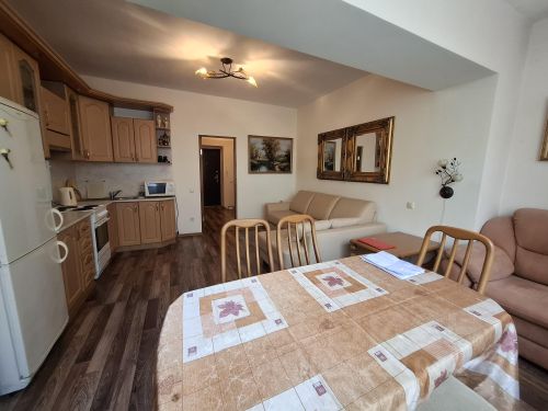 Мебель: двуспальная кровать, диван, шкаф, журнальный столик, обеденная зона на 5 персон