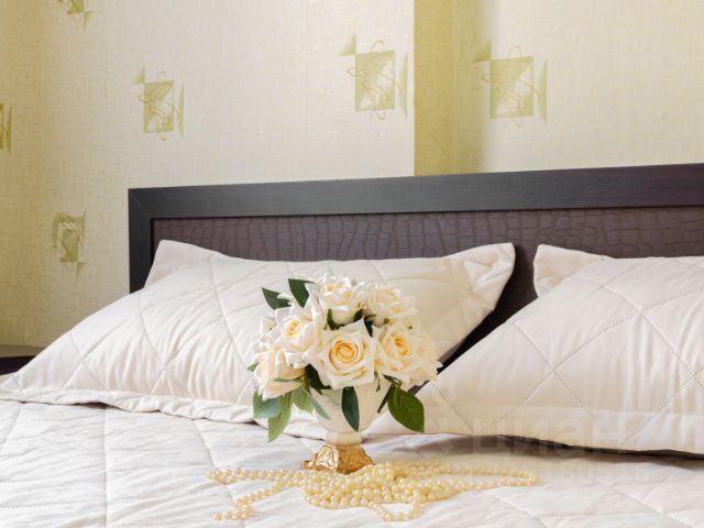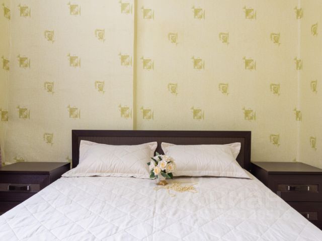 Спальня, в которой расположена двуспальная кровать, прикроватные тумбочки. Постельные принадлежности.