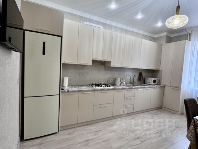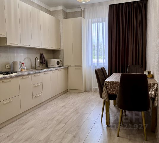 В кухне встроенный кухонный гарнитур фисташкового цвета, с духовым шкафом и микроволновой печью , а также холодильник ,кухонный стол ванильного цвета и белые стулья , вся необходимая посуда.
