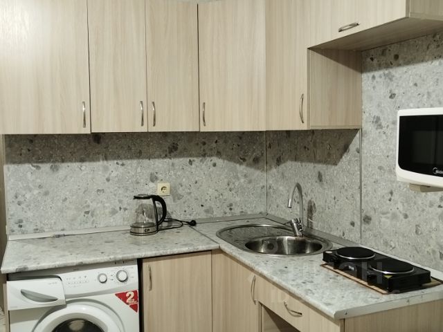 Есть куxонный гарнитуp, шкафы для хранения, обеденная зона, два раздельных спальных места (оба дивана раскладываются), рабочий стол и стул.