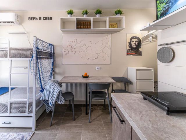 •Функциональное кухонное пространство. Есть все необходимое (посуда, кастрюли, сковородки, кружки, столовые приборы и т.д.). В наличии минимальный набор продуктов: растительное масло, соль, сахар, чай, кофе.
