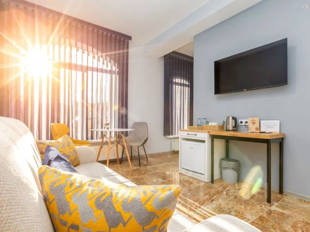 Услуги и удобства: Туалет, Душ, Туалетные принадлежности, Полотенца, Отопление, Телевизор, Холодильник, Шкаф/гардероб, Балкон, Вид на город, Вид на горы, Звукоизоляция, Услуга "звонок-будильник"