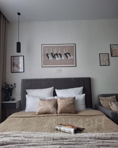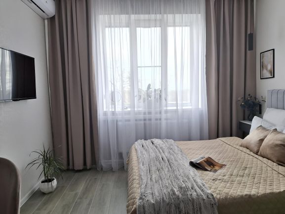 Однокомнатная квартира площадью 41 м2 после капитального ремонта. Двуспальная кровать, доп. место — раскладной диван, прикроватные тумбы-стойки со светильниками. Душевая кабина с тропическим душем. Имеется бытовая техника: кондиционер, двухкамерный холодильник, стиральная машина, духовой шкаф (электрический), СВЧ-печь, чайник, утюг (гладильная доска, сушка), фен. На кухне имеется посуда для приготовления и приёма пищи. Досуг: телевизор, интернет, Wi-Fi, интерактивное телевидение. Очень важно: квартира для некурящих.