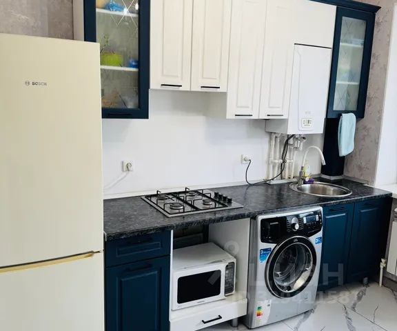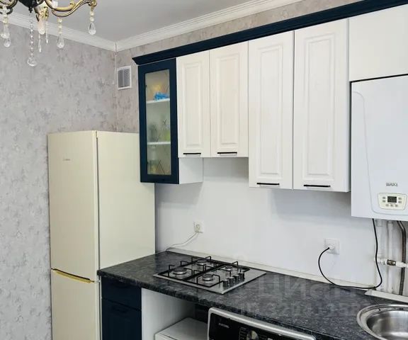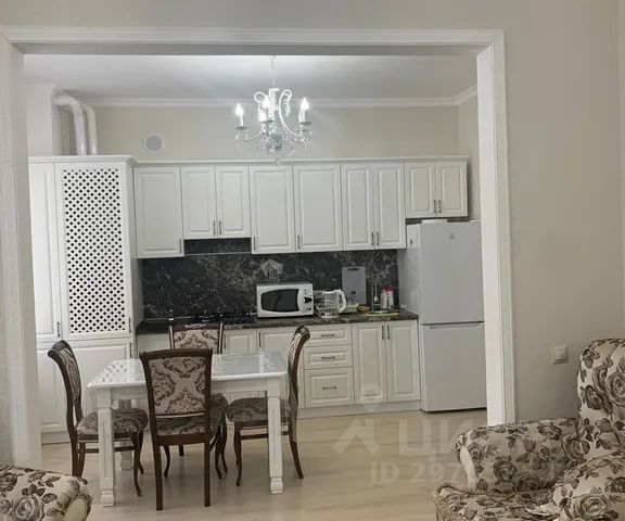 В кухне встроенный кухонный гарнитур фисташкового цвета, с духовым шкафом и микроволновой печью , а также холодильник ,кухонный стол ванильного цвета и белые стулья , вся необходимая посуда.